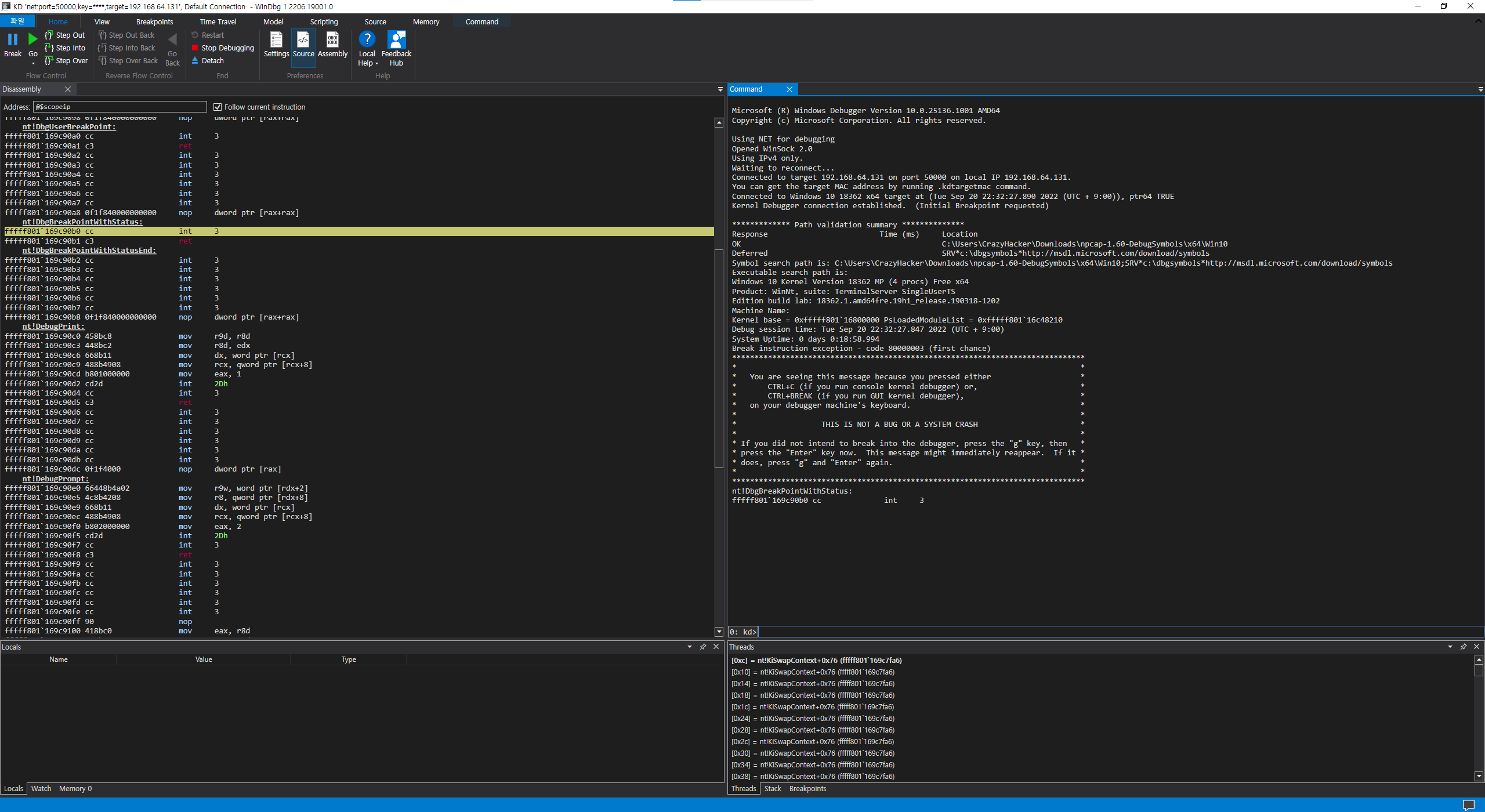 모두 정상적으로 설정하였다면 디버깅 모드로 부팅을 선택한 후 대기하다보면 WinDbg가 연결되는 것을 확인할 수 있다.