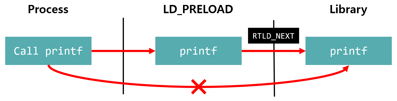 RTLD_NEXT는 현재 라이브러리 다음으로 로드된 라이브러리를 의미하기 때문에 다음 라이브러리부터 차례대로 해당 함수가 존재하는지 라이브러리에서 확인해 주소를 구하게 된다.
