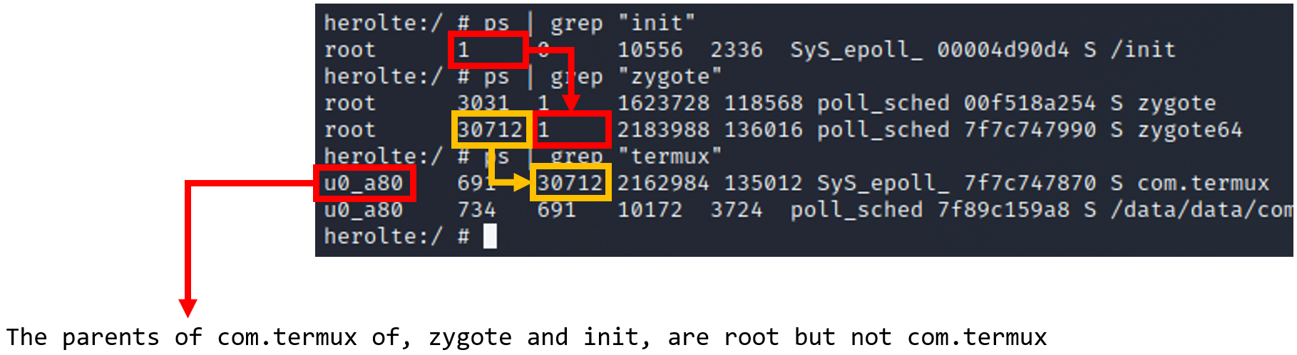 com.termux 애플리케이션의 부모와 조부모인 zygote와 init는 Root권한이지만 com.termux 애플리케이션은 Root 권한이 아닌 일반적인 애플리케이션 권한으로 내려가 있는 것을 확인할 수 있다.