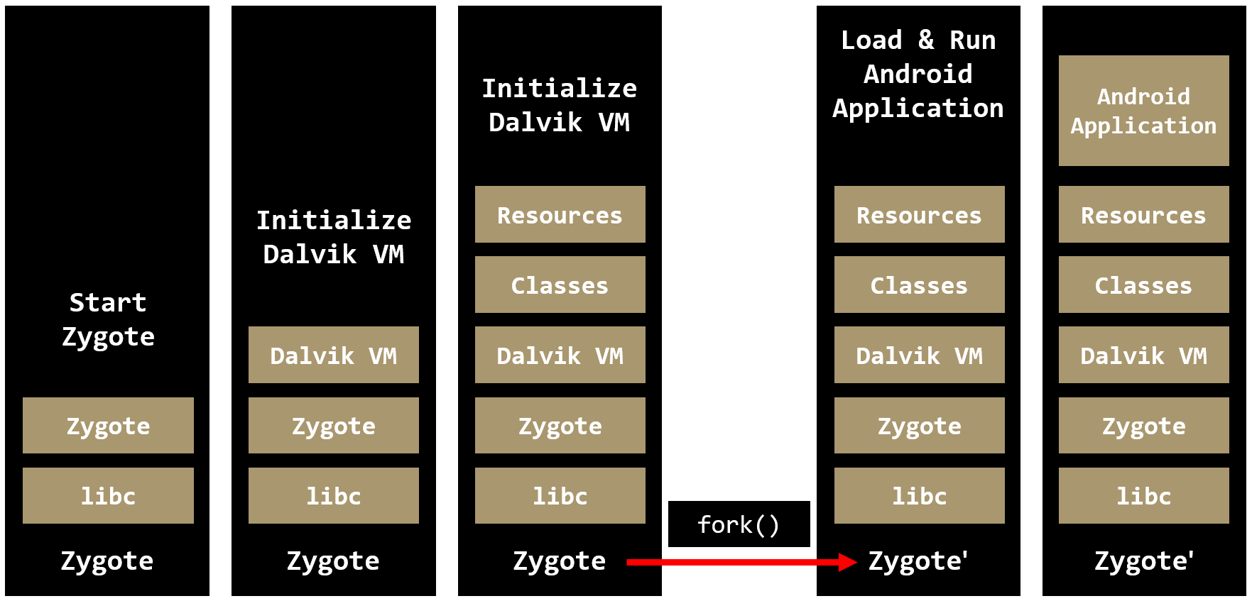 Zygote는 안드로이드 애플리케이션이 실행될 때 필요한 달빅 가상 머신의 초기화와 자원들을 미리 로딩되어 있는데 어떻게 이 리소스를 사용해 애플리케이션을 실행시킬 수 있을까? 바로 fork(clone) 시스템 콜이다.