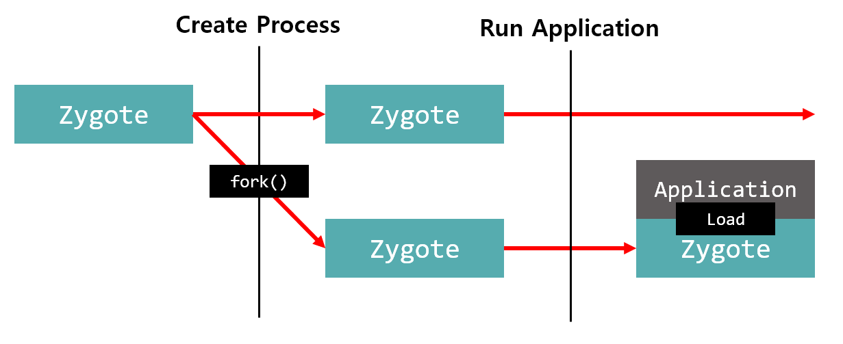 안드로이드에는 Zygote(자이고트)라는 이름의 프로세스가 존재하는데 Zygote는 애플리케이션이 실행되기 전에 가상 머신의 코드 및 메모리 정보를 공유함으로써 애플리케이션이 실행되는 시간을 단축시킬 수 있다.