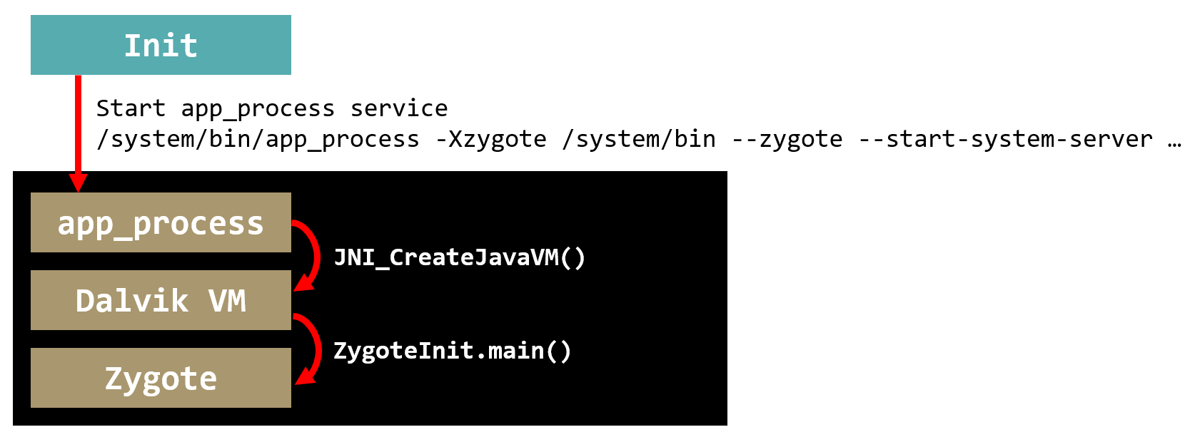 Zygote 또한 자바로 작성되어 있어 다른 네이티브 서비스나 데몬처럼 init 프로세스에서 바로 실행할 수 없다. 그렇기 때문에 Zygote는 app_process를 통해 Dalvik VM을 초기화한 후 ZygoteInit 클래스를 로딩해 실행하는 절차를 거친다.