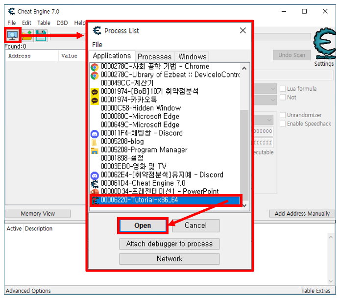 왼쪽위 모니터 아이콘을 클릭하고 Process List에서 튜토리얼 프로그램을 찾아 클릭하고 Open 버튼을 눌러준다.