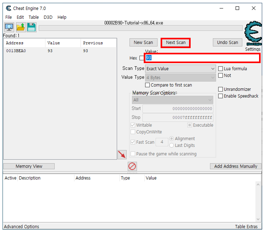 위와 같이 값이 바뀌었다 그렇다면 바뀐 값을 넣고 Next Scan을 눌러주자