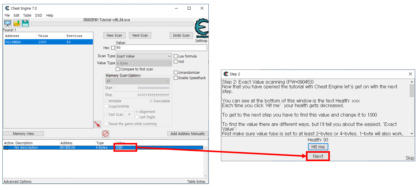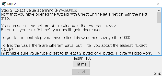 치트엔진 튜토리얼 Step 2 에서는 본격적으로 치트엔진을 사용해 해결하는 문제이다. 우선 클리어 방법은 Health를 1000으로 바꾸면 클리어이다. 우선 Hit me 버튼을 클릭해보자