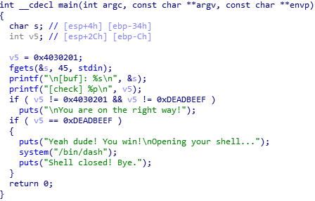 아래쪽 if 문에서 v5가 0xDEADBEEF 라면 Shell을 띄워준다. fgets에서 45바이트를 입력받으므로 s를 40바이트로 모두 채우고Buffer OverFlow 발생시켜 v5를 조작해 Shell을 얻어낼 수 있다.