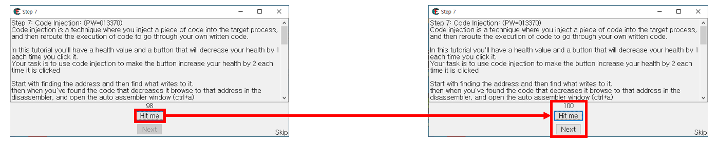 저기 Information에서 Yes를 누르면 패치된 코드가 있는 영역으로 점프된다. 다시 원래 있던 주소로 돌아가고 싶으면 BackSpace키를 누르면 된다. 원래 주소로 돌아가면 기존에 어셈블리가 'jmp 주소' 로 변경 된것을 확인 할 수 있다. 이제 Hit me를 클릭해보면 값이 2 증가하고 Next 버튼이 활성화되는것을 확인 할 수 있다.
