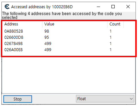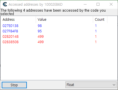 Find out shat addresses this instruction accesses 기능을 사용하면 이 인스트력션을 액세스 하는 모든 주소를 잡아낼 수 있게 된다. 이 상태에서 모든 캐릭터의 Attack 버튼을 눌러준다.