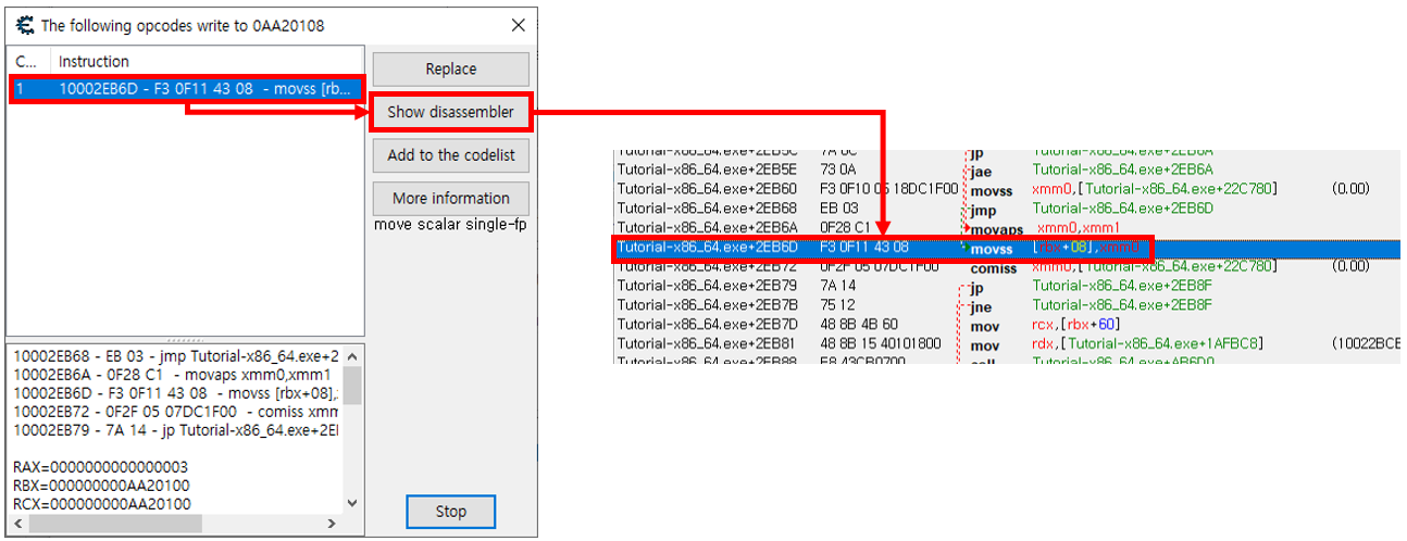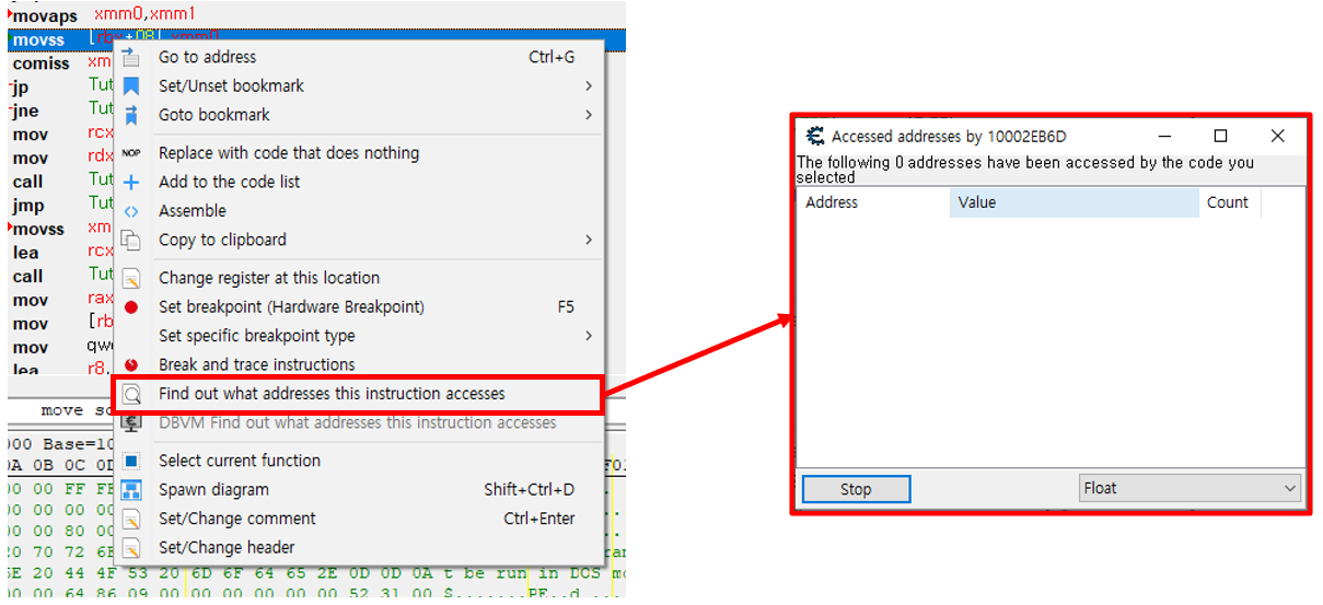 Show disassembler를 눌러 현재 어셈블리가 존재하는 주소로 이동한다. 여기서부터는 새로운 기능을 사용할 것이다. 문제 제목이 Shared Code인 만큼 모든 체력 감소 이벤트가 저 어셈블리를 지나간다는 의미가 된다. 그렇다면 저 어셈블리를 지나가는 모든 값을 잡아내면 다른 캐릭터들의 정보도 찾지 않고 잡아낼 수 있게 된다. 여기서 그냥 Code Injection을 사용하면 되지 않냐는 의문이 생길 수 있는데 문제는 Dave팀의 체력은 유지 상대팀의 체력은 감소해야 하기 때문에 단순히 저 부분만을 Code Injection 해서는 클리어할 수 없다.