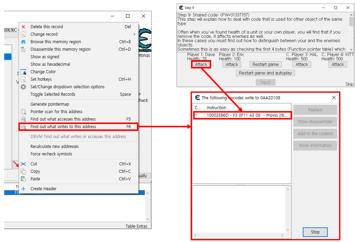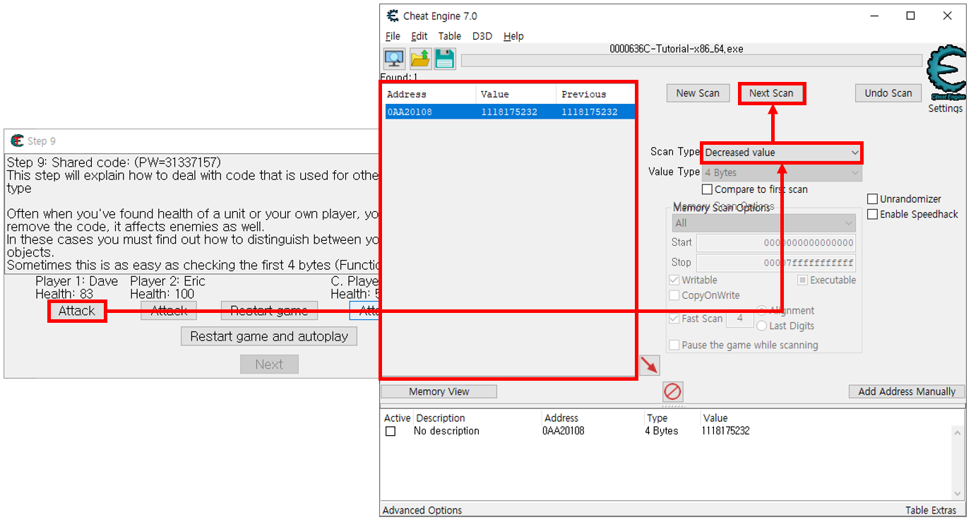 Scan Type을 Unknown initial value로 설정해주고 First Scan 버튼을 눌러준다, 그 후에 Attack 버튼을 눌러 Hit 해주고 이번에는 Scan Type을 Decreased value (감소된 값)으로 설정해준 후 Next Scan 버튼을 누르면 기존에 값에서 감소된 값들을 보여주게 된다. 위 방법을 반복해 플레이어들의 체력을 찾을 수 있다.