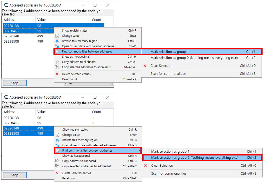 그럼 위 그림과 같이 주소와 Value를 모두 확인할 수 있게된다. 이제 저 주소들을 그룹별로 묶을 수 있다. Dave팀과 적팀 이렇게 2개의 팀(그룹)이 존재하고 각각 2명이니 주소를 2개씩 묶어 그룹으로 구성해준다.
