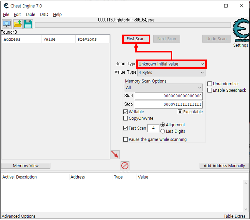 우선 Unknown initial value로 First Scan을 한다. 체력의 정확한 값을 알 수 없으니 체력이 증감하는 것을 이용하여 체력의 주소를 구할 것이다.