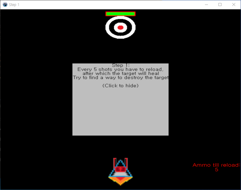 Game Step 1은 과녁의 체력을 모두 깎으면 클리어다. 하지만 게임을 플레이해봤으면 알겠지만 5발을 모두 맞춰야 클리어가 가능하지만 리로드 하는 동안 과녁의 HP가 다시 충전된다. 이 부분을 해결해 클리어하면 된다. 필자는 과녁의 체력을 찾아서 클리어할 예정이다. 다른 여러 클리어 방법도 있지만 그건 직접 해보는 것을 추천한다.