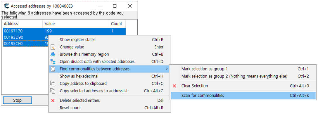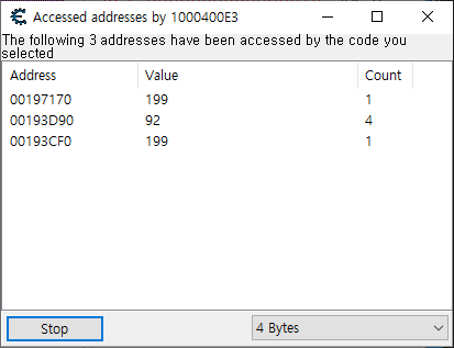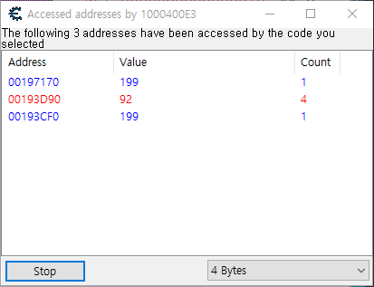 이제는 눈치껏 저렇게 두 값이 적 한명의 체력과 플레이어의 체력이라는걸 직감할 수 있다. 적의 체력을 리스트로 가져오고 Find out what writes to this address 기능을 사용한다.