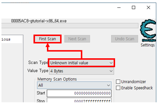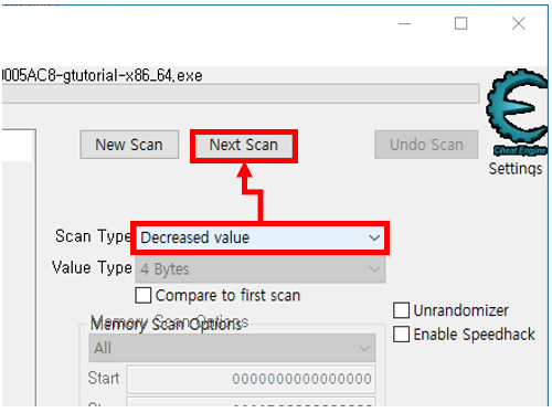 적의 체력을 모르니 당연히 처음은 Unknown initial value으로 스캔한다. 그 후 한 번 공격하고 Decreased value로 스캔을 반복한다.