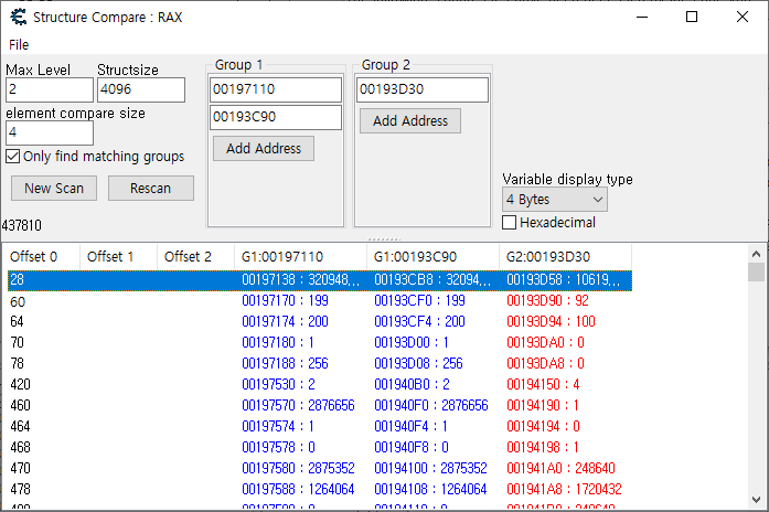 Only find matching groups를 체크해주고 Scan을 시작해준다. 그러면 각각 구조를 비교하여 다른점을 찾아주는데 Offset 0에 60은 체력이 존재한다는 것을 우리는 이미 코드를 통해서 알고 있다. 그 외에 적팀과 플레이어의 다른점은 Offset 0에 70번째를 가지고 구별할 수 있을 것 같다. 적팀은 1로 설정되어 있고 플레이어는 0으로 되어 있으니 이를 이용해 데미지를 조작할 수 있을 것으로 보인다. 그렇다면 Auto Assemble 기능을 사용하자