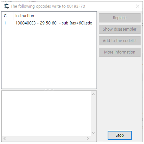 그러면 위와 같이 하나의 Instruction이 잡히는걸 볼 수 있는데 어셈블리가 sub이다. 즉 edx 만큼 체력을 감소시킨다는 말이다. Show disassembler를 눌러 Instruction이 있는 주소로 이동한다.