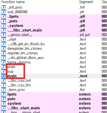 이번 문제에서는 sup라고 하는 사용자 정의 함수가 등장했다. IDA의 Functions window를 확인해보면 현재 바이너리에서 사용하는 함수들을 확인 할 수 있다.