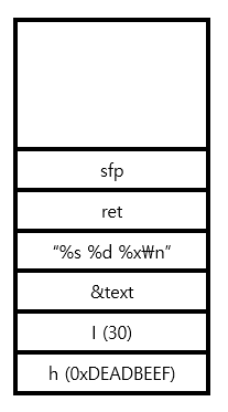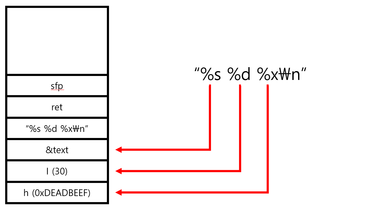 (32bit 기준) 스택은 다음과 같이 생성된다. 마지막 인자부터 순서대로 스택에 쌓고 함수를 호출한다. 그렇게 되면 printf 함수는 첫번째 인자로 들어온 문지열을 분석한다. 서식문자를 보고 그 위치에 맞게 인자로 들어온 변수를 출력하게 된다.