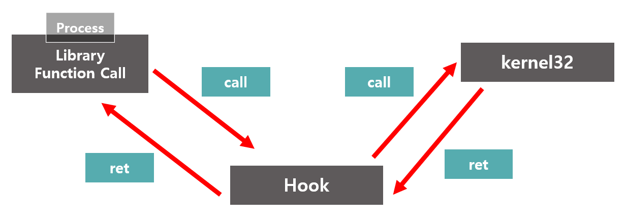 프로세스가 kernel32.dll에 있는 API 함수를 호출한다. kernel32.dll 은 해당 함수를 실행하고 반환 값을 프로세스에게 돌려준다. 다음은 특정 함수가 후킹되었을 때의 API 호출과정이다.