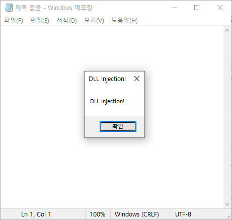 DLL Injection은 DLL Injector와 DLL만 존재하면 되기 때문에 벌써 마지막 Step이다. 이제 완성된 DLL Injector와 DLL을 사용해 notepad에 DLL Injection을 시도하고 메시지 박스가 정상적으로 띄워지는 것을 확인하면 DLL Injection 성공이다.