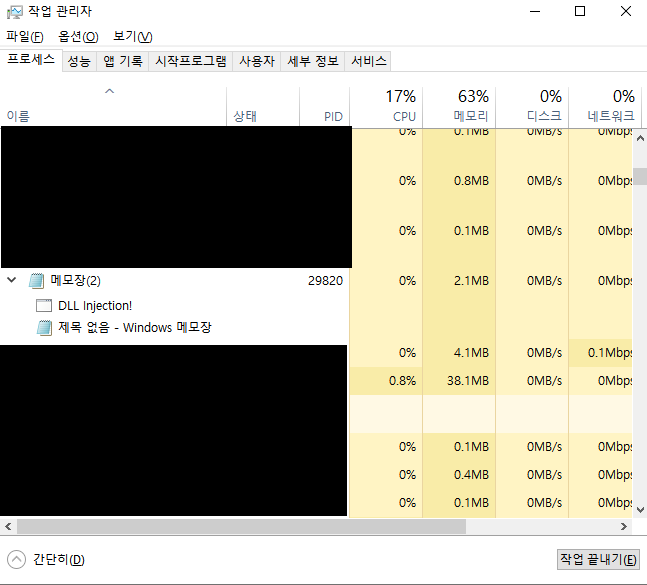 이렇게 작업관리자에서도 메모장이 메시지 박스를 띄운것을 확인할 수 있다.