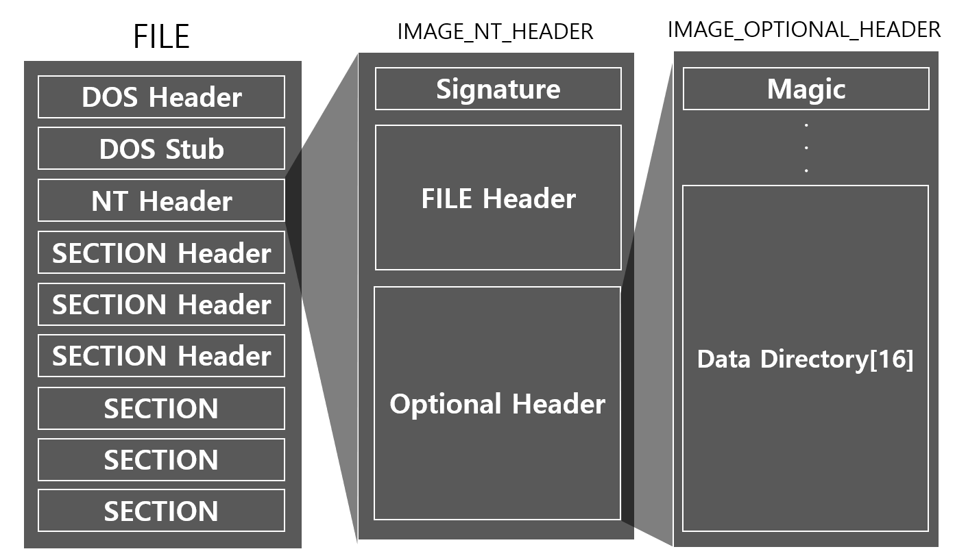 IMAGE_IMPORT_DESCRIPTOR의 주소는 NT Header(IMAGE_NT_HEADER)를 통해 구할 수 있다. 주소를 구하는 방법은 다음과 같다.