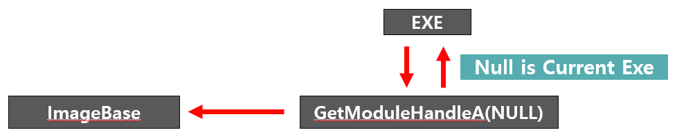 GetModuleHandleA 함수는 현재 로르된 모듈들 중, 인자로 들어온 모듈 이름의 ImageBase 주소를 반환해준다. 만약 인자로 NULL 을 주면 현재 exe 프로그램의 ImageBase를 반환한다. 그리고 해당 주소는 IMAGE_DOS_HEADER의 주소이다.