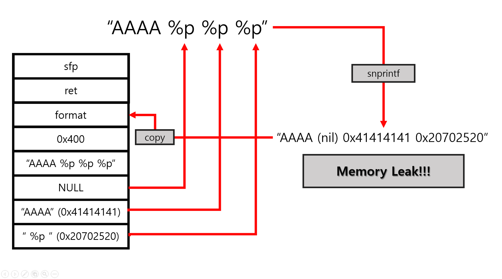 위와 같이 snprintf가 세 번째 인자로 들어온 문자열을 보고 서식문자가 존재하면 스택에서 그 값을 찾아 서식문자에 맞게 출력하게 된다. 이때 우리는 서식문자에 맞는 인자를 넣어주지 않았으므로 그대로 스택에 있는 값이 출력되어