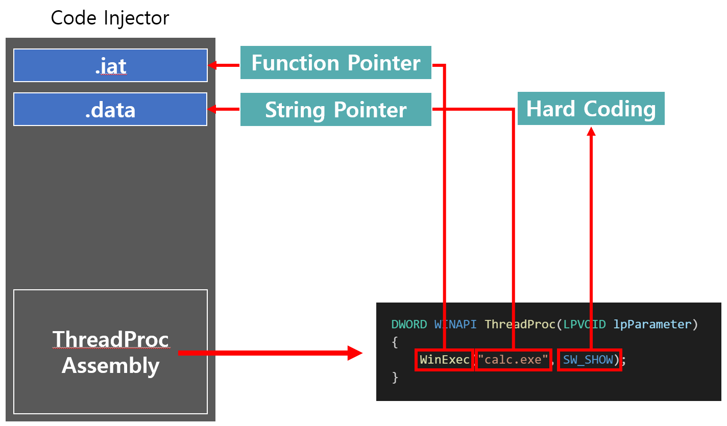 0x1E54A422AB0는 "calc.exe" 문자열을 가르킨다. 그리고 0x1E54A426D8C에는 WinExec의 주소가 들어있다. 하지만 타겟 프로세스의 공간에는 해당 문자열("calc.exe")과 IAT(WinExec의 주소)가 존재하지 않는다. 따라서 우리는 타겟 프로세스에 인자로 들어가는 문자열(실행시킬 프로그램 이름)과 WinExec의 주소를 전달해줘야한다.