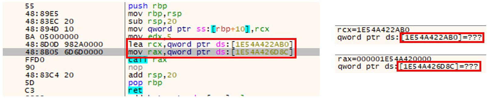 주입된 어셈블리(코드)를 확인해보면 0x1E54A422AB0를 첫번째 인자로 넘기고 0x1E54A426D8C에서 WinExec의 주소를 rax로 가져와 call 하게 된다. 하지만 해당 2개의 주소는 존재하지(사용되지) 않는 것을 확인할 수 있다.