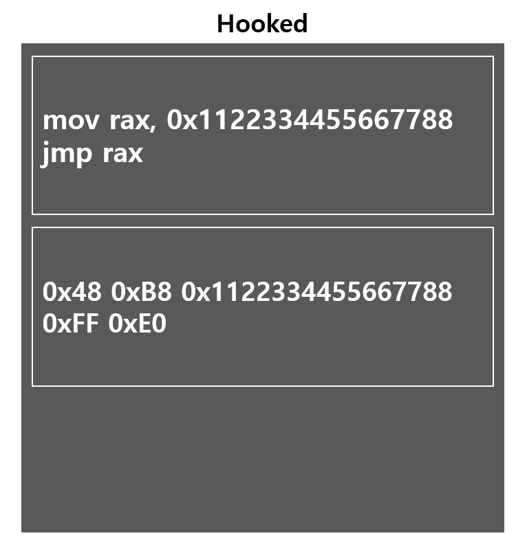 타겟 API의 상위 12바이트를 mov and jmp 어셈블리로 패치하여 후킹한다. 여기서 12바이트인 이유는 x64 시스템은 주소체계가 8바이트이기 때문에 기존의 x86의 후킹 방식으로는 4바이트 이상의 범위에 있는 주소로는 점프하지 못한다는 단점이 존재한다.