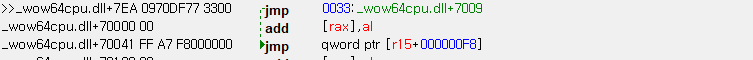 jmp dword ptr ds:[Wow64Transition] # Wow64Transition = wow64cpu.dll + 0x6000