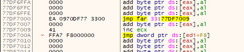 해당 어셈블리는 CS 레지스터의 값을 변경하고 0x77DF7009의 주소로 점프한다. 그리고 해당 주소의 어셈블리를 확인해보면 jmp qword ptr [r15+0xF8] 으로 64Bit에서 사용되는 레지스터를 사용하는 것을 확인할 수 있다.
