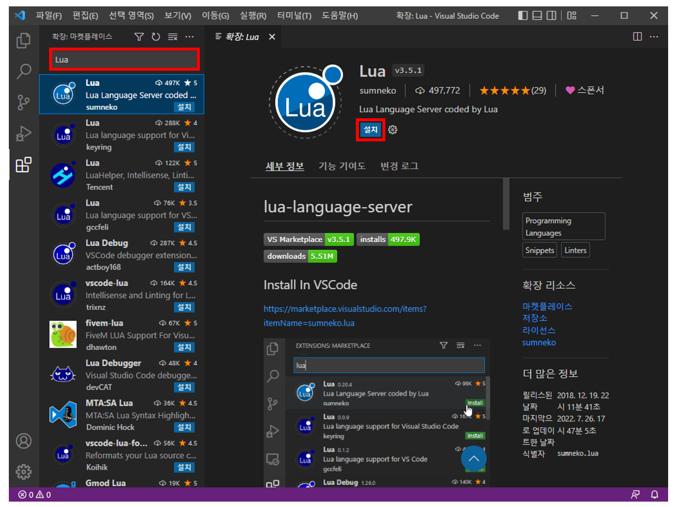 VS Code에서 Lua Script에 대한 확장을 설치해줘야 한다.